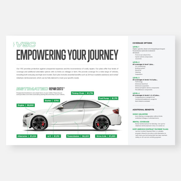 Created to be a valuable tool for customers at the F&I desk, our VSC desk mats provide helpful product information such as coverage details, eligibility, infographics, and more.